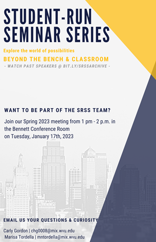 Watch past speakers at bit.ly/SRSSArchive. Email your questions and curiosity to Carly Gordon (chg0008@mix.wvu.edu) & Marisa Tordella (mntordella@mix.wvu.edu)!