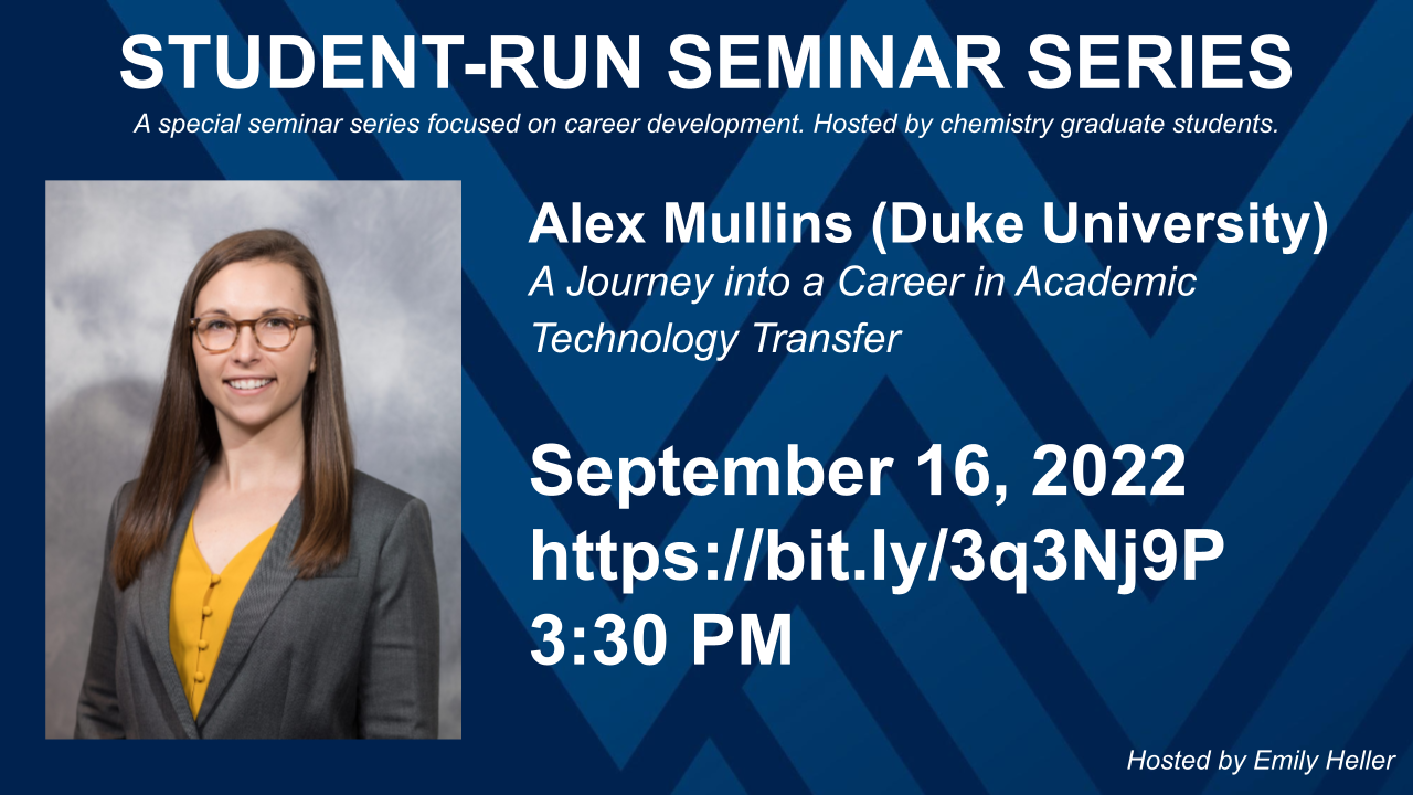 Abstract: University labs across the world are making scientific breakthroughs every day. However, choosing and navigating a path to make these discoveries available for society's benefit can be challenging. Technology transfer is a field that shepherds academic inventions from the lab bench to products and services that impact our lives and the world around us. Alex Mullins, Assistant Director at Duke University's Office for Translation and Commercialization, describes her experience starting a career in academic technology transfer.