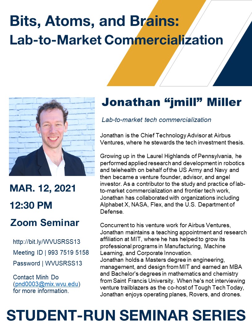 Growing up in the Laurel Highlands of Pennsylvania, he performed applied research and development in robotics and telehealth on behalf of the US Army and Navy and then became a venture founder, advisor, and angel investor. As a contributor to the study and practice of lab-to-market commercialization and frontier tech work, Jonathan has collaborated with organizations including Alphabet X, NASA, Flex, and the U.S. Department of Defense.