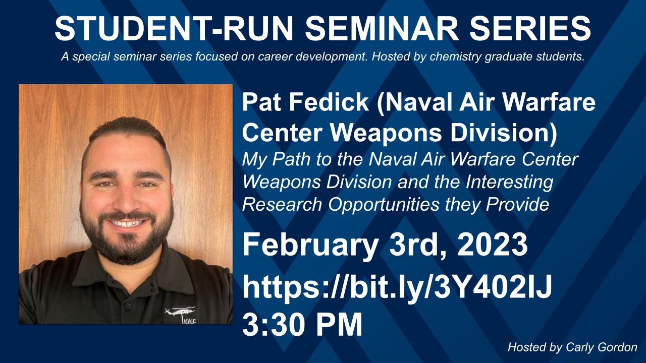 Abstract: This session will cover my experience and path to my career at NAWCWD, which included multiple academic and government internships throughout my undergraduate and graduate career. These opportunities will be highlighted, such as the Naval Research Enterprise Internship Program (NREIP) and the Science, Mathematics, and Research for Transformation (SMART) program. Ultimately the SMART scholarship led me to NAWCWD, which is a scholarship that is open to both undergraduates and graduate students, specifically for those wanting to be a civilian scientist within the Department of Defense (DoD). In addition to tips and tricks that I have learned along the way, I will also discuss the research department at NAWCWD, as well as some active research projects that are ongoing within my group. Many students are exposed to two career paths, academia and industry, however there are rich basic and applied research areas within the DoD. As a mass spectrometrist by training, some of my research includes new analytical techniques for detecting, identifying, and remediating environmental pollutants, but other areas include new synthetic techniques for the development of energetics by high throughput reaction screening through robotics, microdroplet and thin film chemistries, and on-line reaction monitoring.